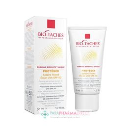 Bio-Taches® Solaire Haute Protection SPF50 Invisible est une crème solaire apportant une solution pour la prise en charge des tâches brunes et de l'hyperpigmentation cutanée, notamment dans les cas suivants : Mélasma (masque de grossesse), dyschromie (taches de vieillesse), lentigo solaire, marques cicatricielles post-inflammatoires (acné,…).