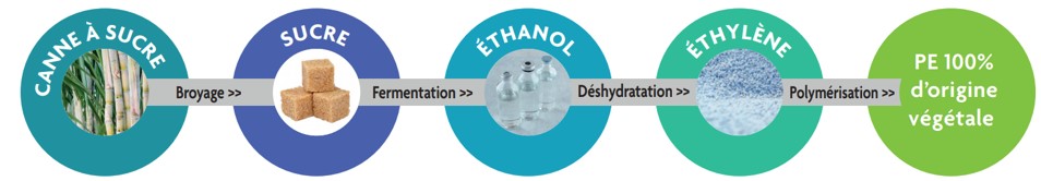 Le PE d’origine végétale, également appelé plastique biosourcé, est fabriqué à partir d’éthanol issu de la canne à sucre. Il possède les mêmes propriétés de protection et de conservation qu’un PE classique, mais sa fabrication est beaucoup plus écologique.