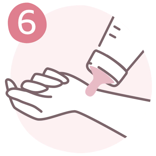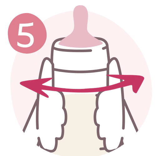Fermez le biberon avec la bague et la tétine. Faites rouler le biberon entre vos mains pour faire descendre la poudre de lait puis agitez-le de haut en bas jusqu'à dissolution complète. |