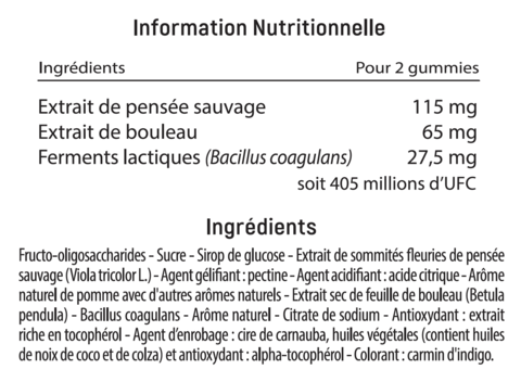 Nos gummies ont été formulés avec un complexe à base d'actifs végétaux tels que LA PENSÉE SAUVAGE, LE BOULEAU ainsi que des PROBIOTIQUES, des nutriments essentiels pour détoxifier sa peau et son organisme.