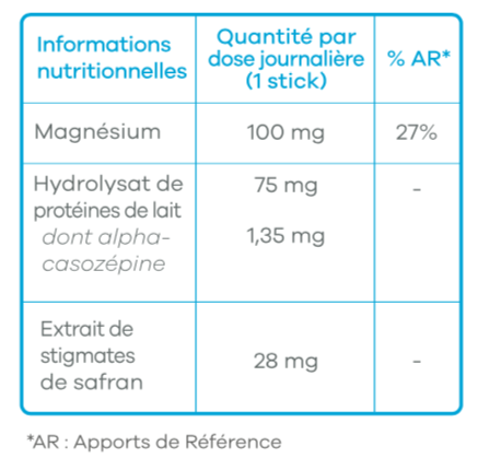 Fructose, oxyde de magnésium, Agent de charge: cellulose microcristalline, hydrosylat de protéines de lait titré en alpha-casozépine (Lactium), amidon de riz, arôme, extrait de stigmates de safran standardisé à 3.5% de lepticrosalides ( Crocus sativus) affron, Correcteur d'acidité : acide citrique.