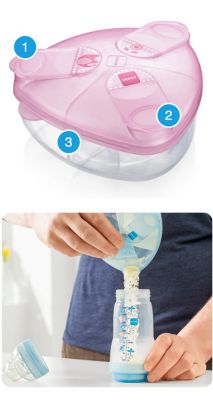 Le distributeur de lait en poudre est particulièrement léger et peut contenir jusqu'à 3 doses de lait en poudre. Grâce à sa forme triangulaire innovante, le lait en poudre est introduit dans le biberon sans laisser de résidus. Idéal pour des parents actifs et idéal pour les sorties.