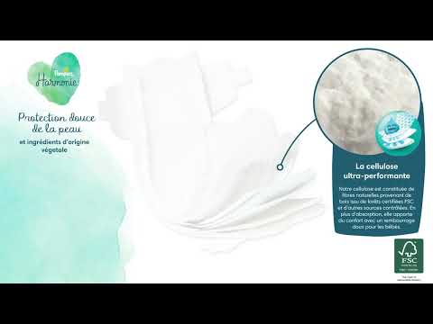 Fabriquées avec du coton de haute qualité*, des fibres d’origine végétale et d’autres matériaux sélectionnés avec soin, les couches Pampers Harmonie sont hypoallergéniques et protègent la peau délicate de votre bébé. Elles ne contiennent aucun parfum ni lotion, ni aucun des allergènes listés par l’UE. Pampers Harmonie offre jusqu’à 12h bien au sec, pour une protection intégrale contre les fuites.
